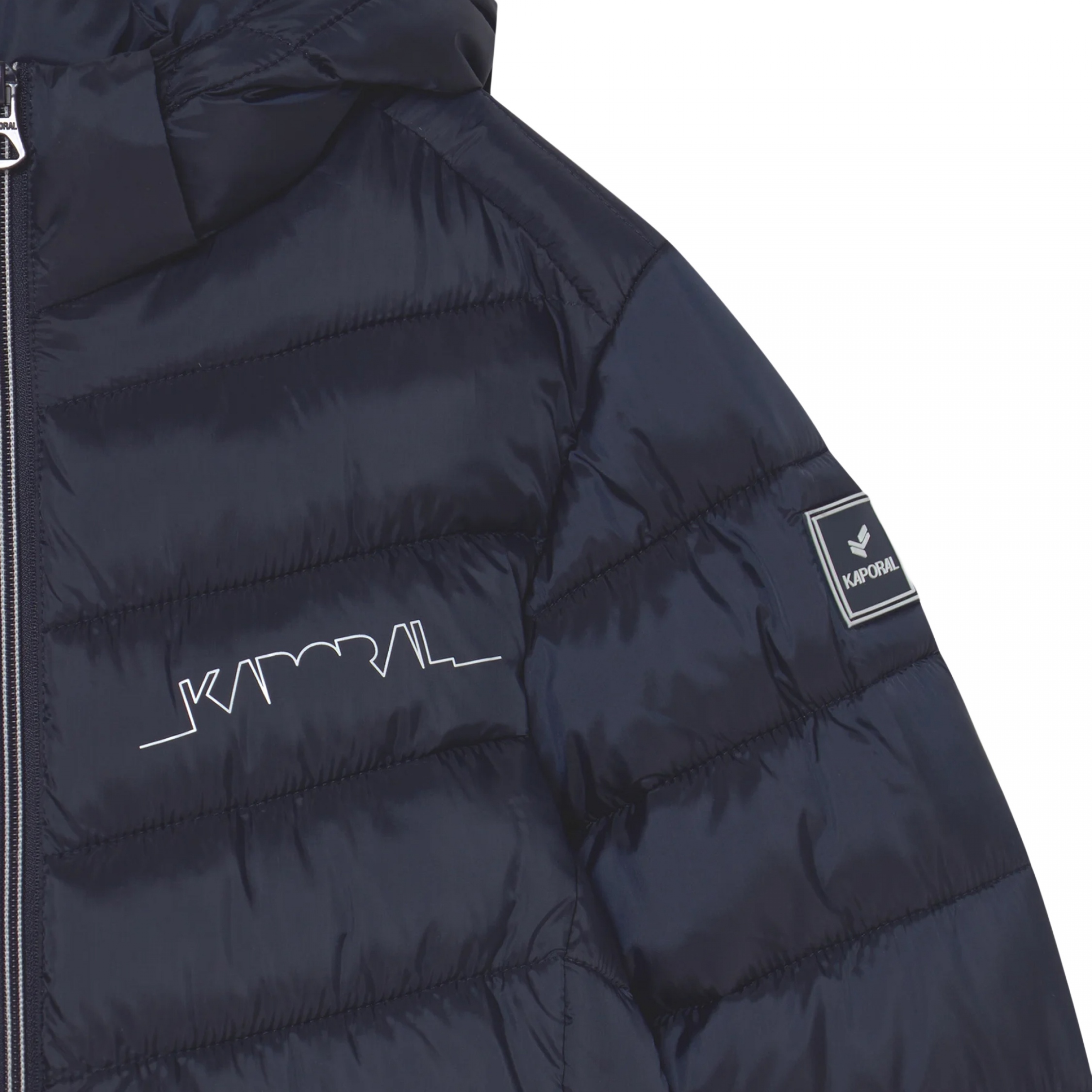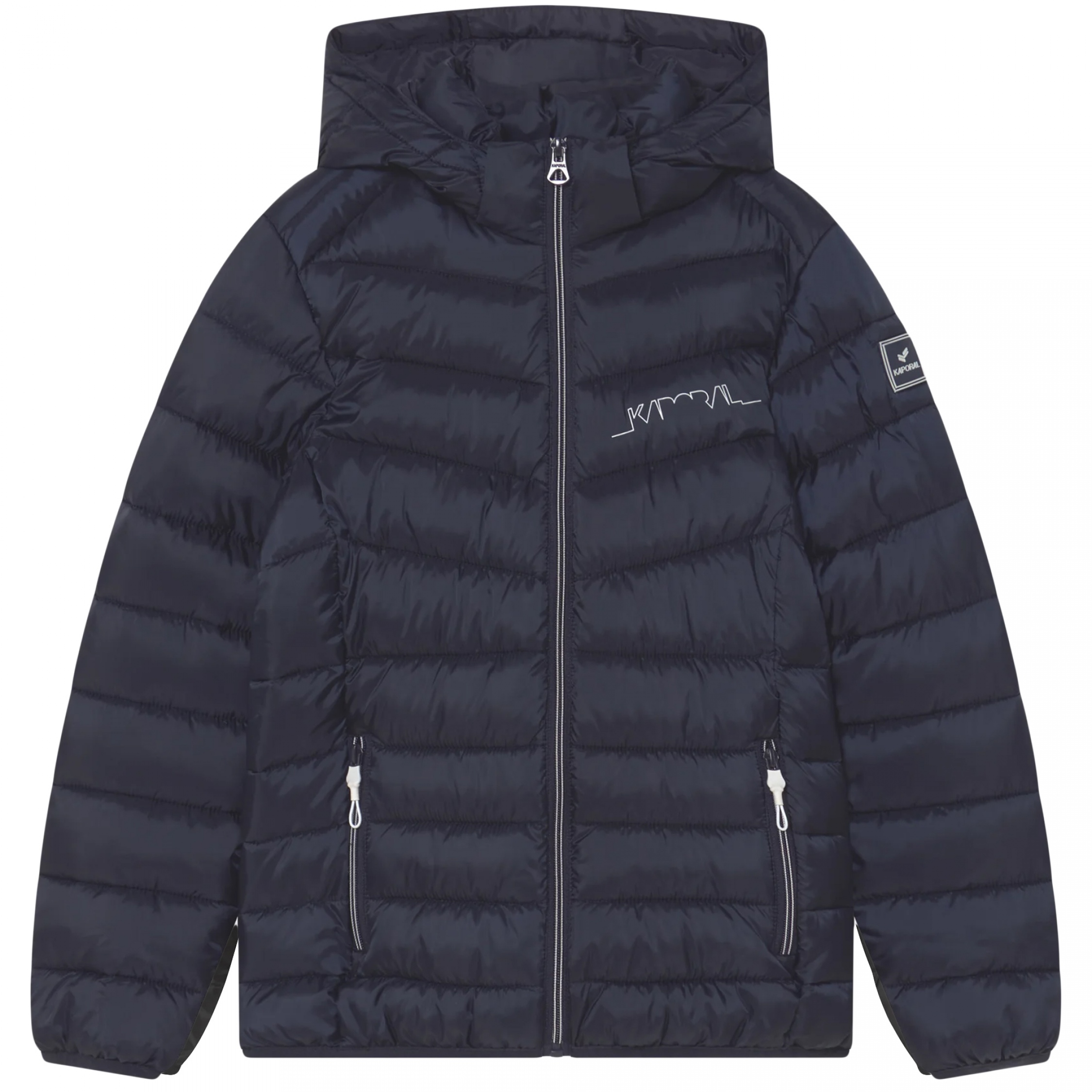 Doudoune à capuche – Inscription Kaporal sur la poitrine – Deux poches zippées – Fermeture devant zippée – Poignets et base élastique – Patch sur le bras gauche – Une poche intérieure fermée par scratch Couleur / Délavage: Bleu foncé Composition: Polyester Nom: à capuche Manches: Longues Col: Capuche Fermeture: A zip