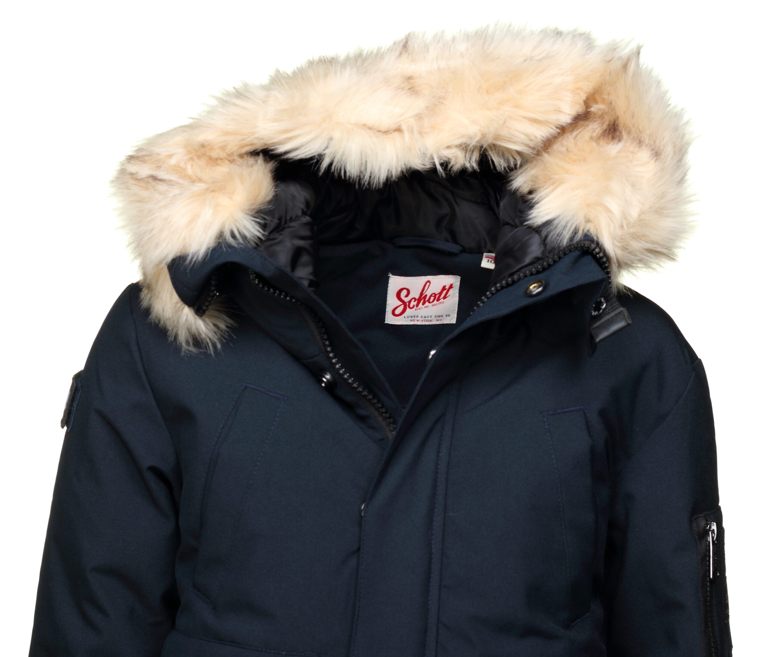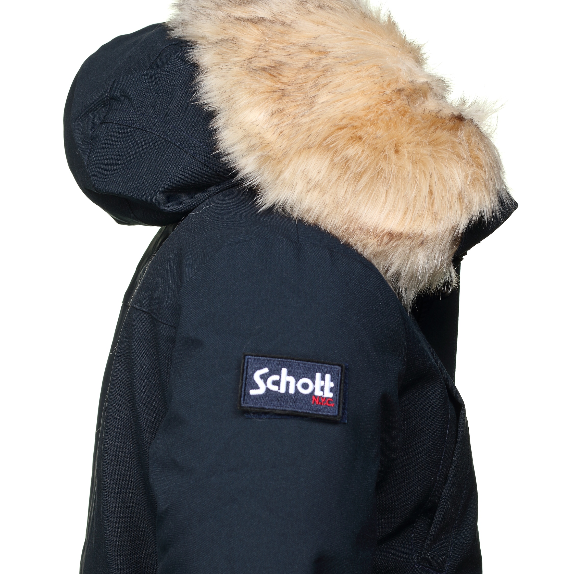 Blouson Schott – Logo Schott brodé sur l’épaule – Capuche fixe – Fausse fourrure amovible – Fermeture zippée à rabat pressionné – 1 poches zippée manche gauche – 2 Poches basses à rabat pressionné – 2 Poches intérieures – Composition : 100% polyester Couleur / Délavage: Bleu foncé Composition: Polyester Nom: à fausse fourrure Manches: Longues Col: Capuche Fermeture: A zip