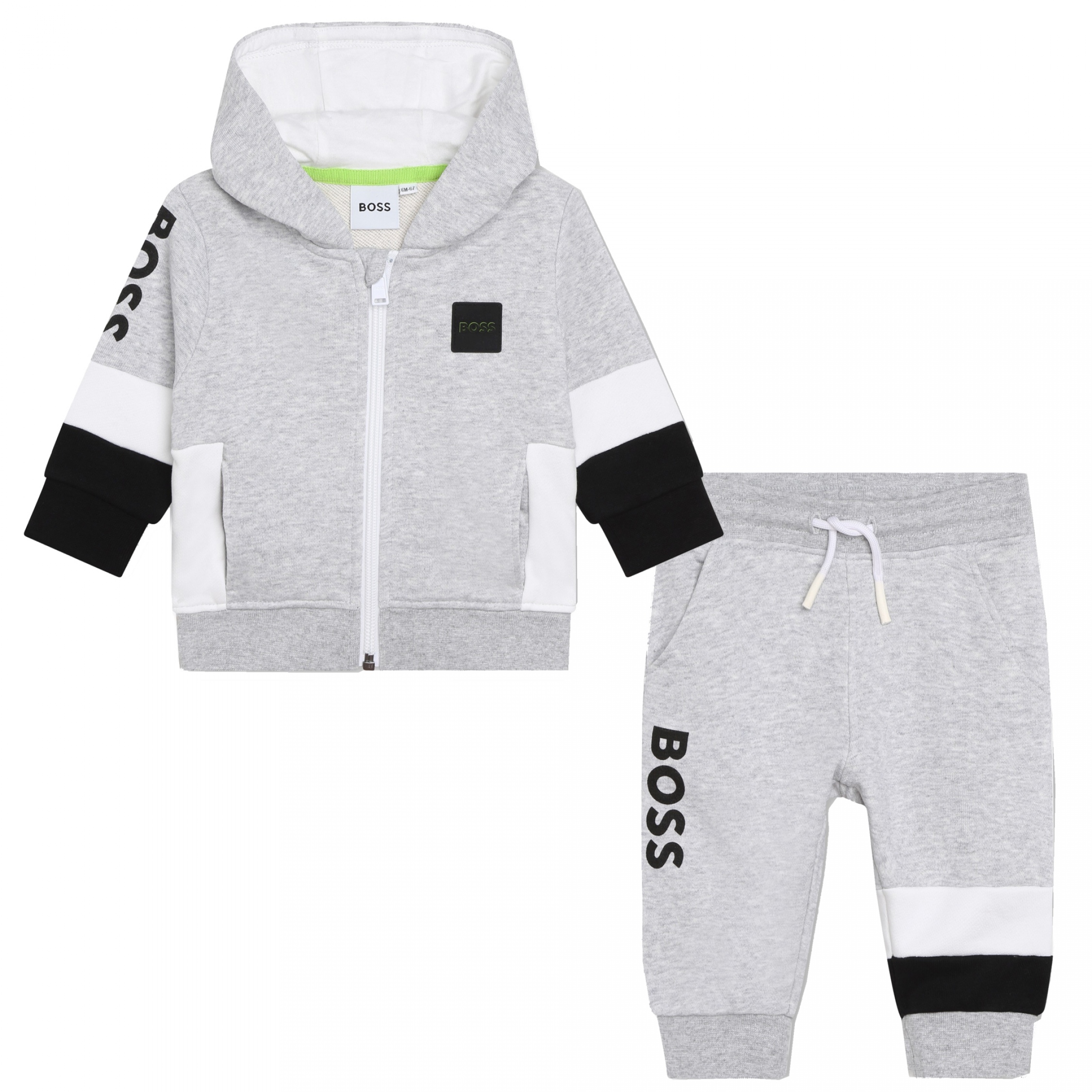 Ensemble deux pièces – Gilet : Patch Boss brodé sur la poitrine – Deux poches latérales – Fermeture à zip – Manches longues – Col à capuche – Jogging : Boss imprimé à l’avant – Poches latérales – Taille élastique avec lacet de resserrage Couleur / Délavage: Gris Composition: Coton Nom: 2 pièces Manches: Longues Col: Capuche Composition 2: Polyester
