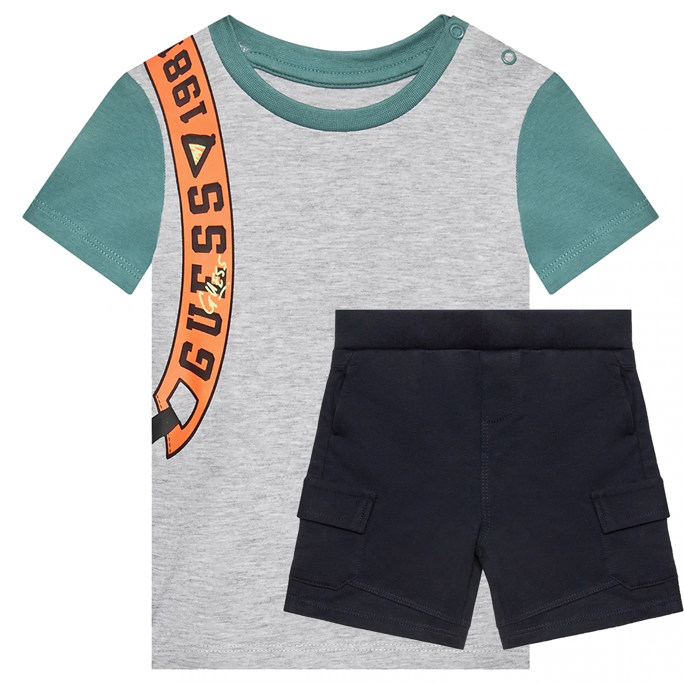 Ensemble deux pièces – T-shirt : Guess imprimé à l’avant – Bouts pressionnés sur l’épaule – Manches courtes – Col rond – Short : Guess imprimé à l’arrière – Deux poches latérales – Deux poches à l’arrière – Taille élastique Couleur / Délavage: Gris / bleu Nom: 2 pièces Manches: Courtes Col: Rond Composition: Coton Composition 2: Viscose Composition 3: élasthanne