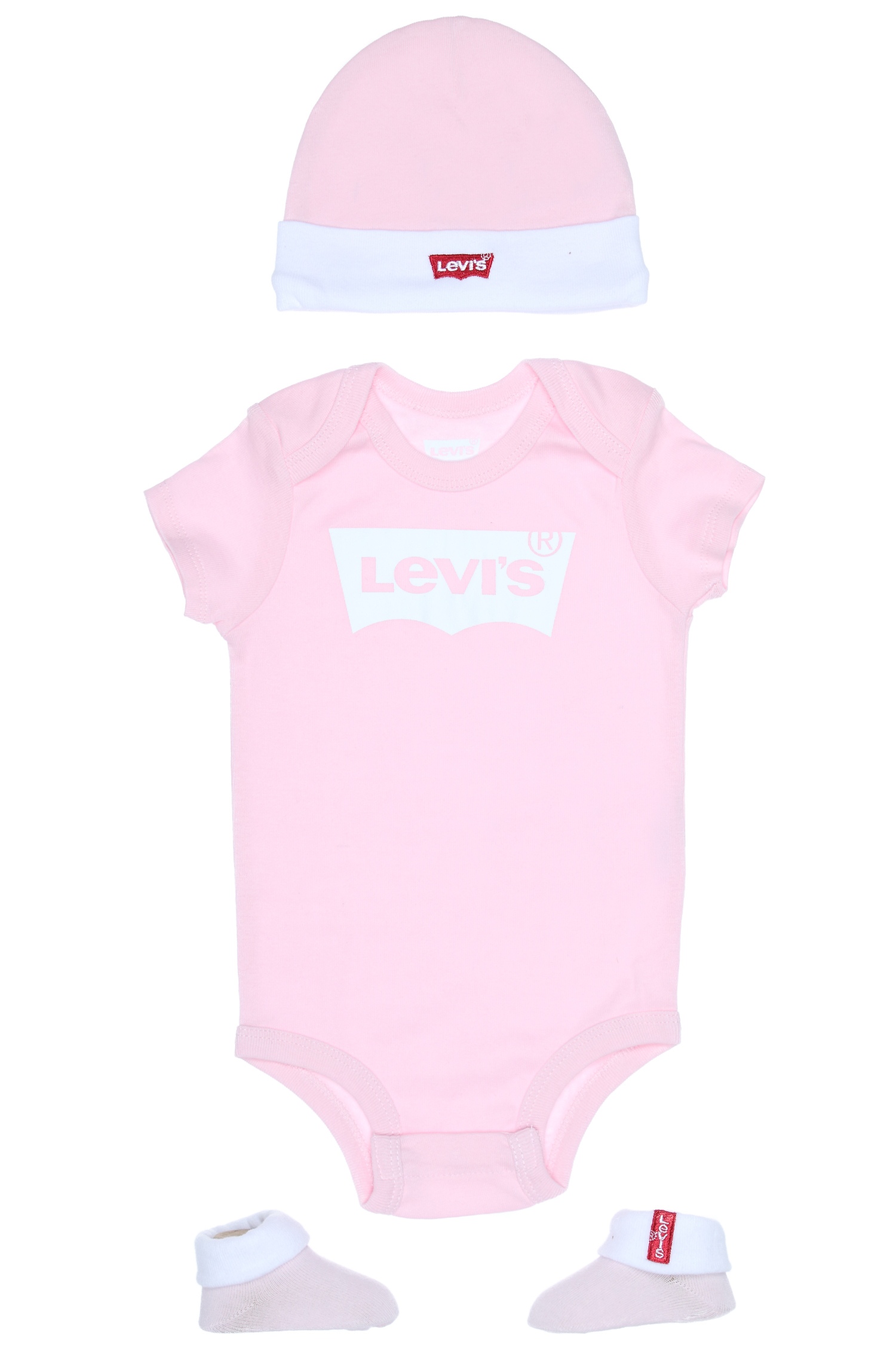 Ensemble 3 pièces Levi’s Kids – Logo sur l’avant du body – Col rond – Manches courtes – Bouton-pression sur le bas du body – Bonnet avec logo brodé sur le bas – Petits chaussons assortis Couleur / Délavage: Rose / blanc Composition: Coton Nom: logotypé Manches: Courtes Col: Rond