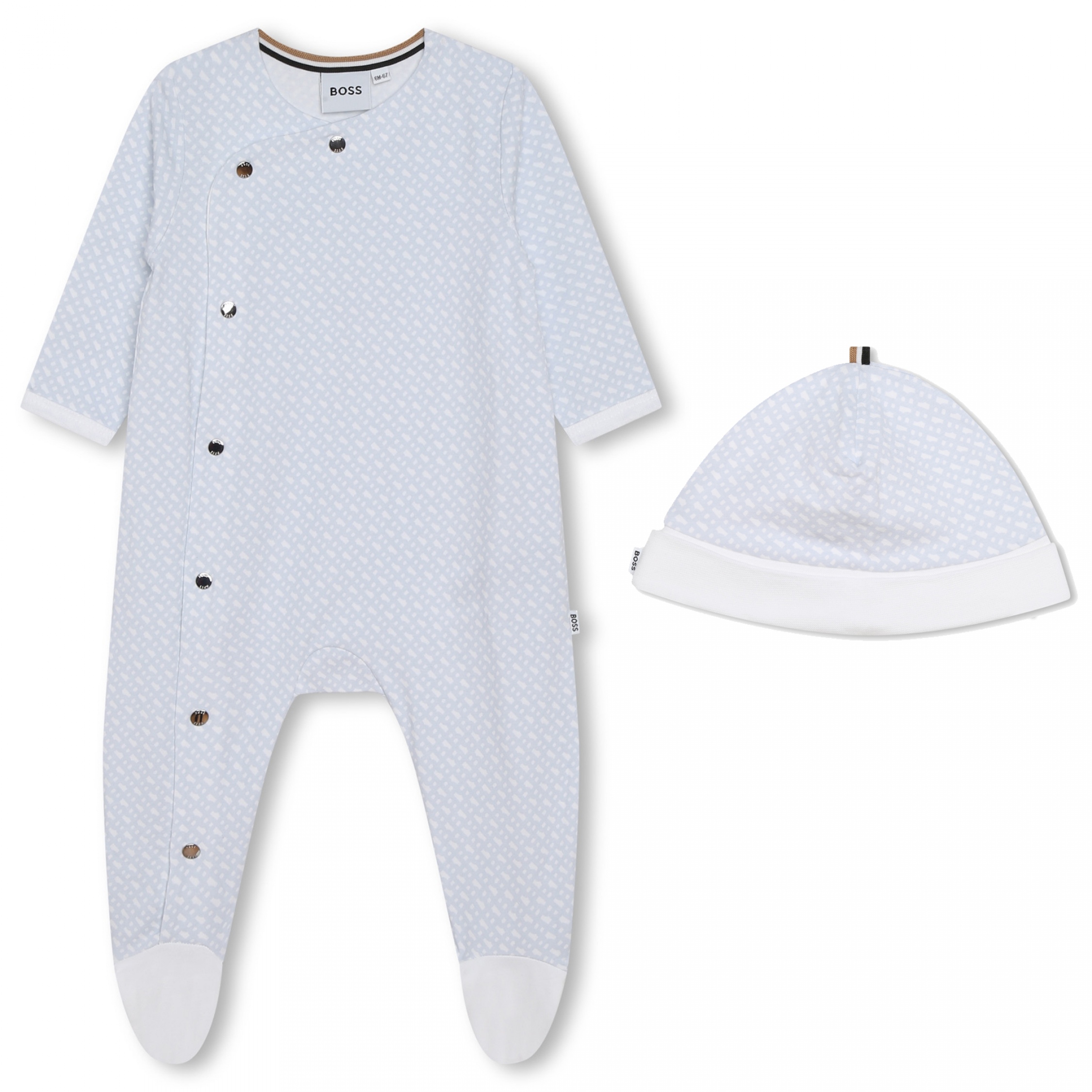 Pyjama deux pièces – Combinaison : B de Boss logotypés sur l’ensemble – Manches longues – Col rond – Fermeture à boutons pressionnés – Bonnet inclus – En coffret Couleur / Délavage: Bleu clair Nom: 2 pièces Manches: Longues Col: Rond Composition: Coton Composition 2: élasthanne